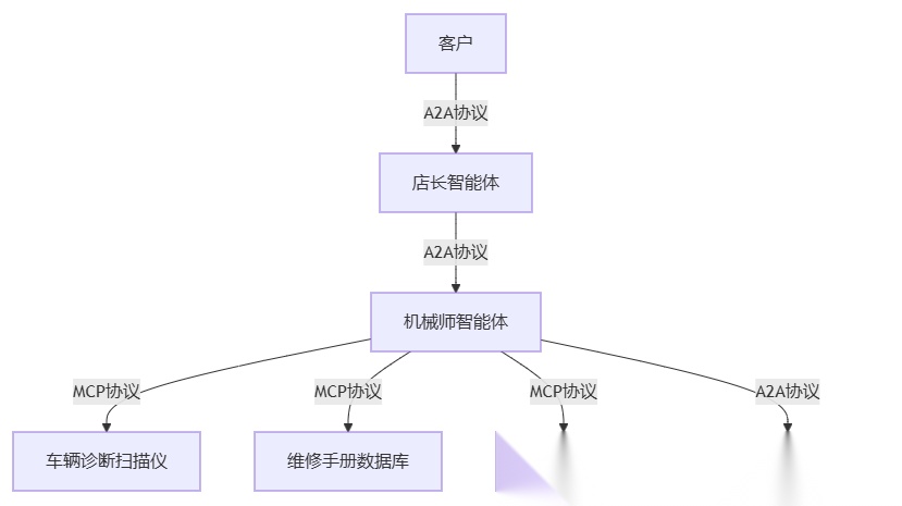 例如,下图展示了一个汽车维修店的场景,店长智能体 和 机械师智能体 通过A2A协议完成任务移交(hand-off),店长可以处理常见问题,但机械师可以解决技术难题。机械师智能体再通过MCP协议完成内部工具使用完成具体任务,还可以通过A2A协议和零件供应商Agent完成外部协作。