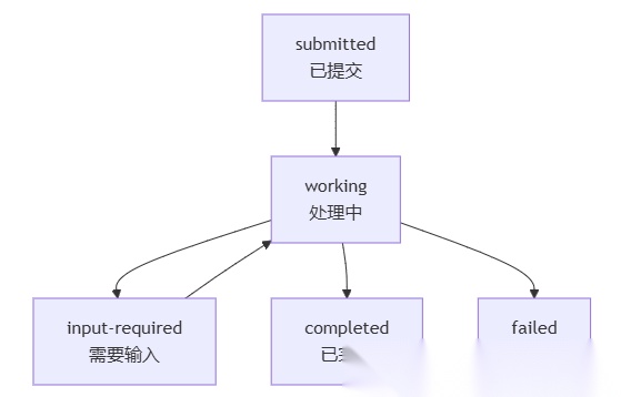 Task的主要具体状态有:submitted, working, completed, canceled, failed 等,下图展示了Task的状态机转换流。