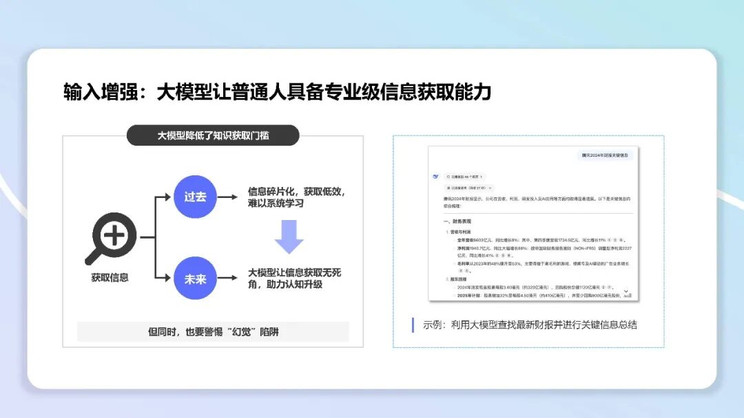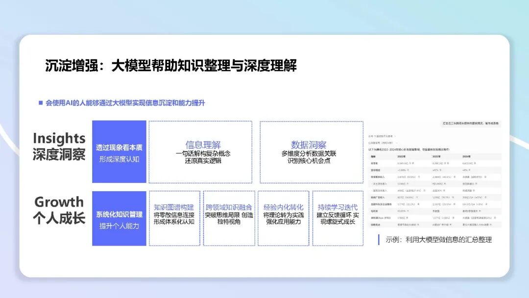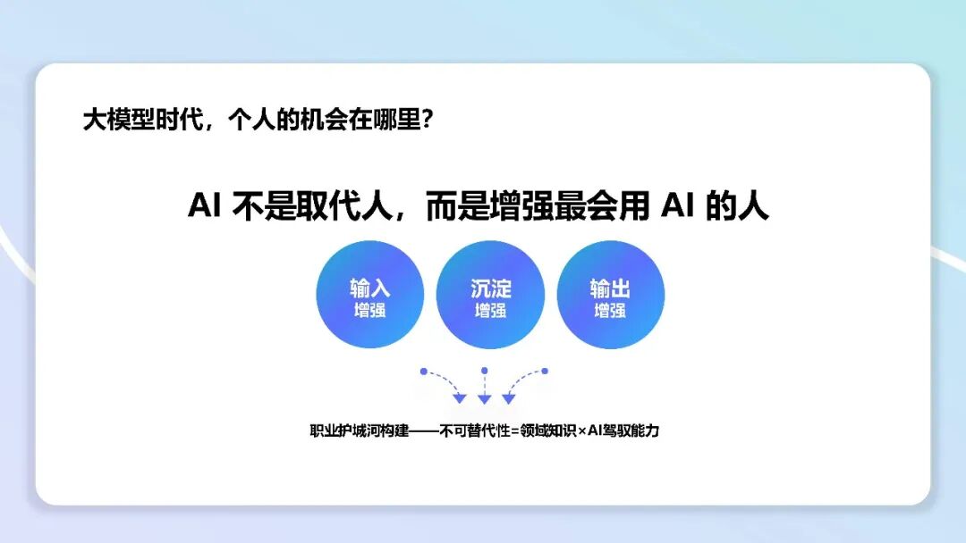 在 AI 时代,个人的机会不仅在于技术的应用,更在于能力的提升。AI 不是取代人,而是增强最会用 AI 的人。通过输入增强,个人可以获取更专业的信息;通过沉淀增强,个人可以实现知识的深度理解;通过输出增强,个人可以创造更大的价值。这种能力的提升不仅为企业带来了更高效的人才,也为个人带来了更广阔的发展空间。