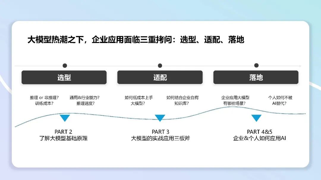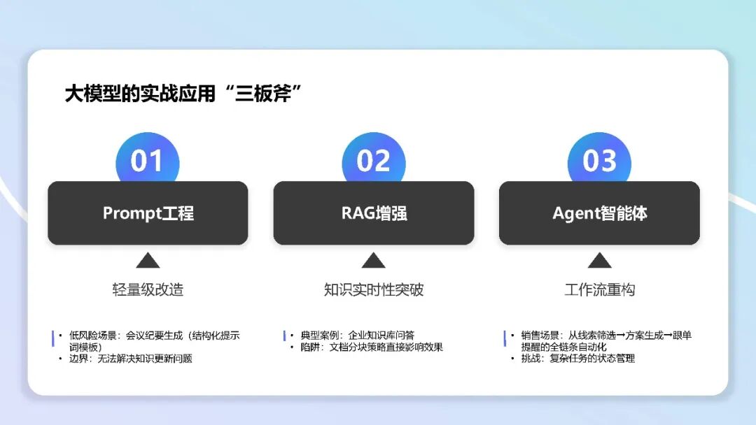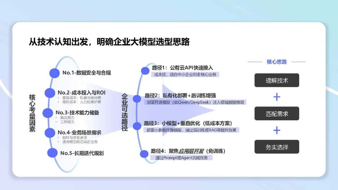 在大模型热潮下,企业面临着三重关键问题:选型、适配与落地。首先,企业需要明确自身需求,选择适合的推理或非推理模型,同时考虑通用与行业能力的平衡。适配问题也至关重要,企业需要将大模型与自身知识库相结合,实现低成本的上手与应用。落地场景的探索是实现商业价值的关键,企业需要在多个场景中验证大模型的有效性,从而推动其在实际业务中的应用。