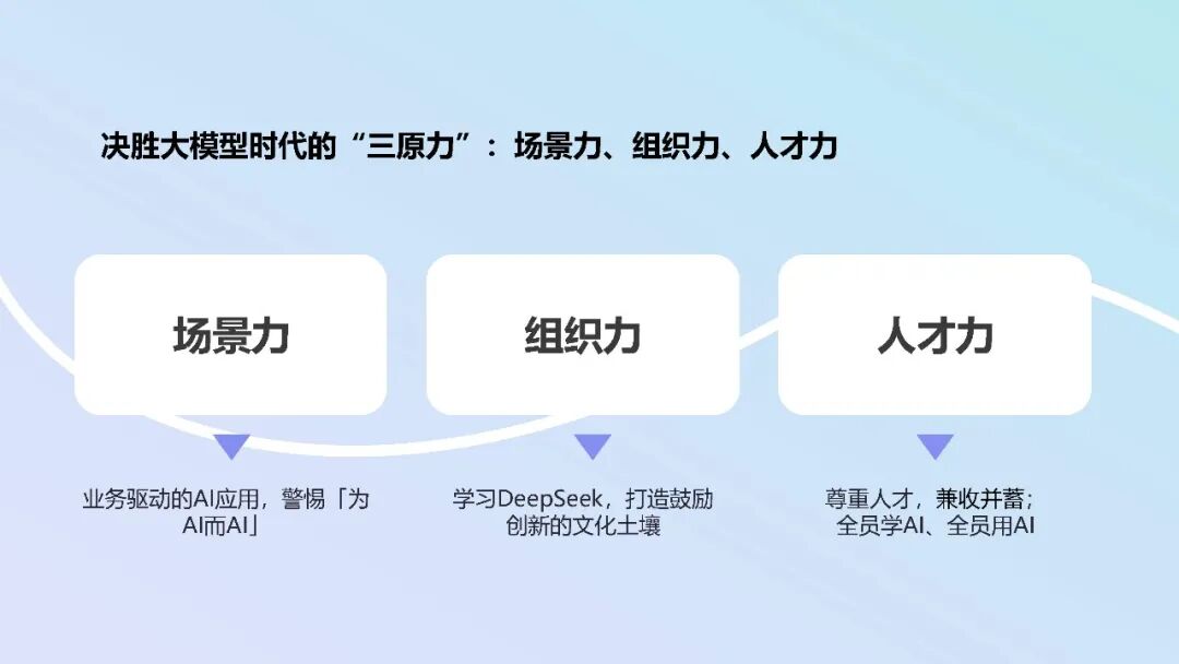 人才力是企业应用大模型的关键。通过尊重人才、兼收并蓄,企业可以吸引和留住优秀的 AI 人才。例如通过提供良好的工作环境和发展机会,企业可以吸引更多的 AI 专家加入,从而推动企业的技术创新和业务发展。