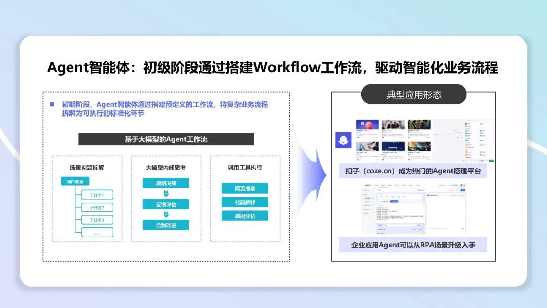 Agent 智能体是大模型应用的高级阶段。通过搭建预定义的工作流,Agent 智能体可以将复杂业务流程拆解为标准化环节,实现自动化执行。例如在销售场景中,Agent 智能体可以从线索筛选到方案生成再到跟单,实现全流程的自动化。这种应用不仅提高了效率,还为企业带来了更智能的业务流程管理。