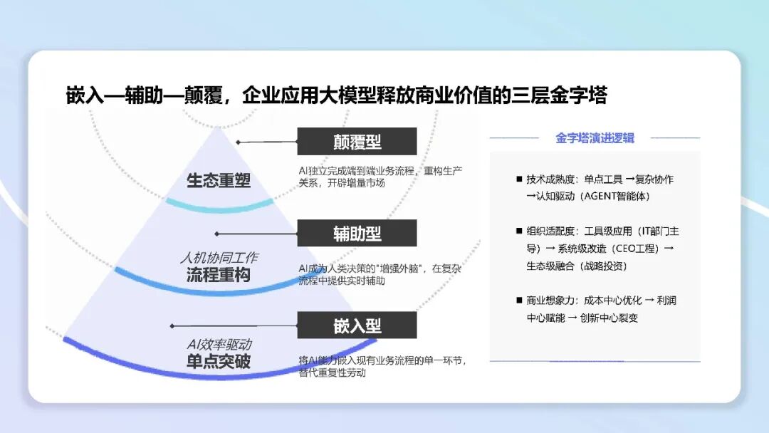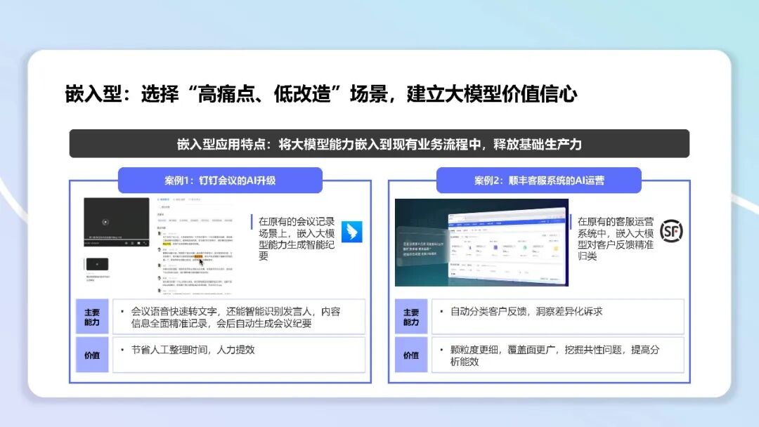 嵌入型应用是企业应用大模型的基础阶段。通过将大模型能力嵌入现有业务流程的单一环节,企业可以实现效率的显著提升。例如钉钉会议的 AI 升级和顺丰客服系统的 AI 运营,都是通过嵌入大模型能力,实现了会议记录和客服反馈的自动化处理。这种应用不仅节省了人力成本,还提高了信息处理的效率。