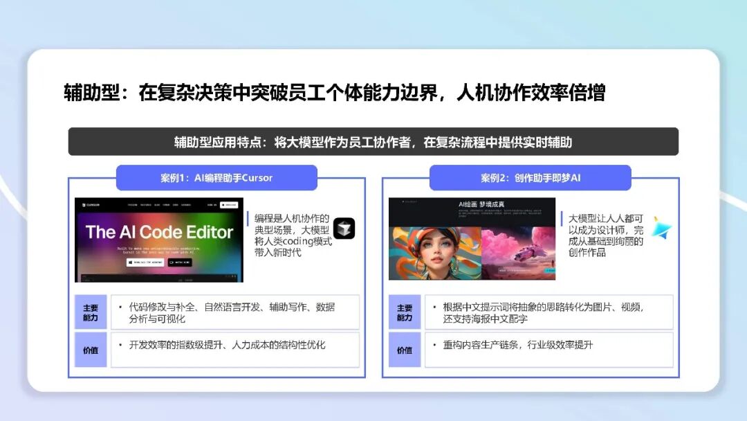 辅助型应用是企业应用大模型的中级阶段。通过人机协同工作,大模型成为人类决策的“增强外脑”,在复杂流程中提供实时辅助。例如在金融风险评估中,大模型可以快速分析大量数据,为决策者提供精准的建议。这种应用不仅提高了决策效率,还为企业带来了更科学的决策支持。
