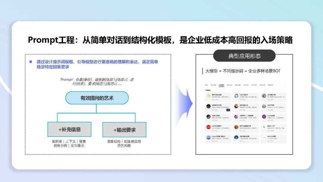 Prompt 工程是企业应用大模型的起点。通过设计结构化的提示词模板,企业可以引导大模型进行更准确的理解和表达,从而满足特定场景的需求。例如在会议纪要生成中,通过提示词模板,大模型可以快速将语音记录转化为结构化的会议纪要,极大地提高了工作效率。这种应用不仅成本低,而且效果显著,是企业快速拥抱 AI 的理想选择。