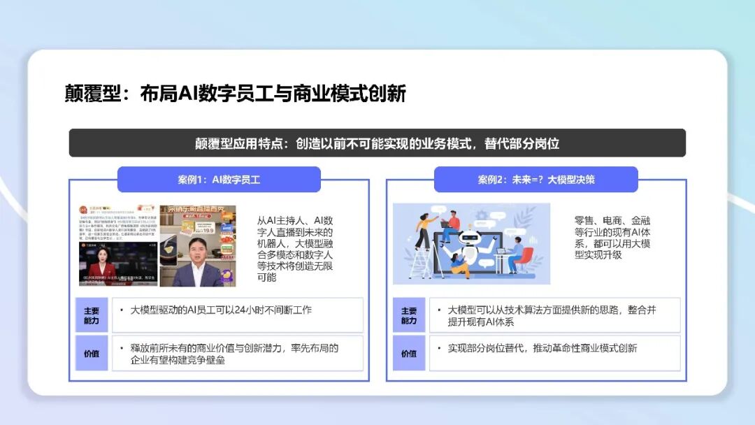 颠覆型应用是企业应用大模型的高级阶段。通过 AI 独立完成端到端业务流程,企业可以实现生产关系的重构,开辟增量市场。例如在智能工厂中,大模型可以实现从生产计划到质量控制的全流程自动化,从而实现生产效率的大幅提升。