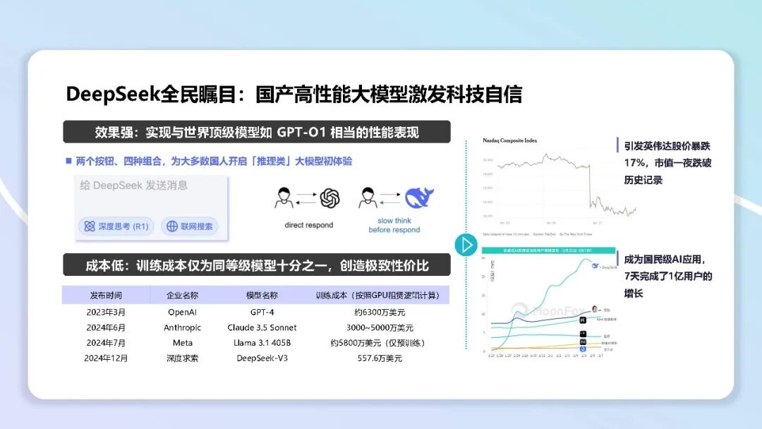 在全球 AI 竞赛中,中国正以惊人的速度实现弯道超车。以 DeepSeek 为例,这一国产高性能大模型不仅在性能上与世界顶级模型相当,更在训练成本上实现了极致的性价比。数据显示,DeepSeek-V3 的训练成本仅为 557.6 万美元,相较于 OpenAI 的 GPT-4 的 6300 万美元,这一成本优势极为显著。这种成本控制不仅降低了企业应用大模型的门槛,更为中国企业在 AI 领域的广泛应用提供了坚实基础。