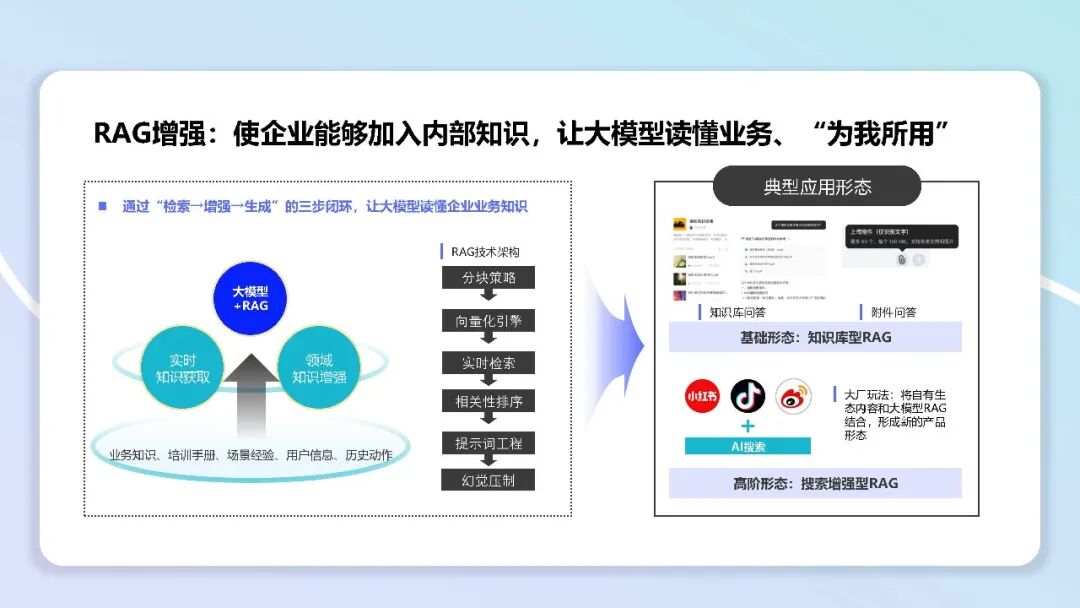 RAG(Retrieval-Augmented Generation)技术通过将企业内部知识与大模型相结合,使模型能够更好地理解企业业务。通过向量化引擎和实时检索技术,大模型可以快速获取企业知识库中的信息,从而提供更精准的答案。这种技术不仅解决了知识更新的问题,还为企业提供了更强大的知识管理工具。