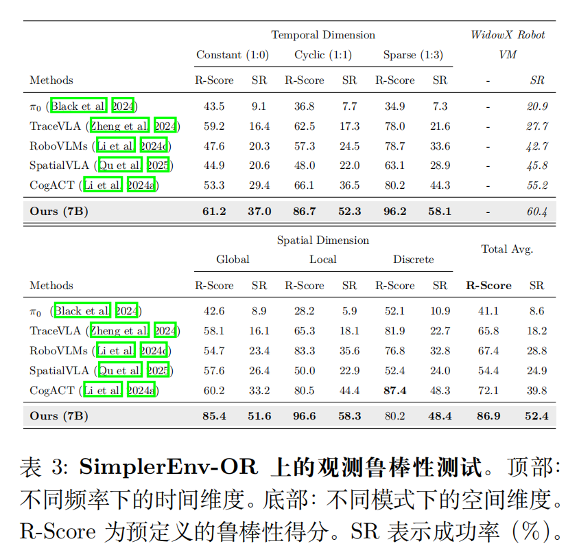 - 基准创新:提出 SimplerEnv-OR,填补 VLA 模型鲁棒性评估的空白,支持 24 种时空干扰的定量测试;