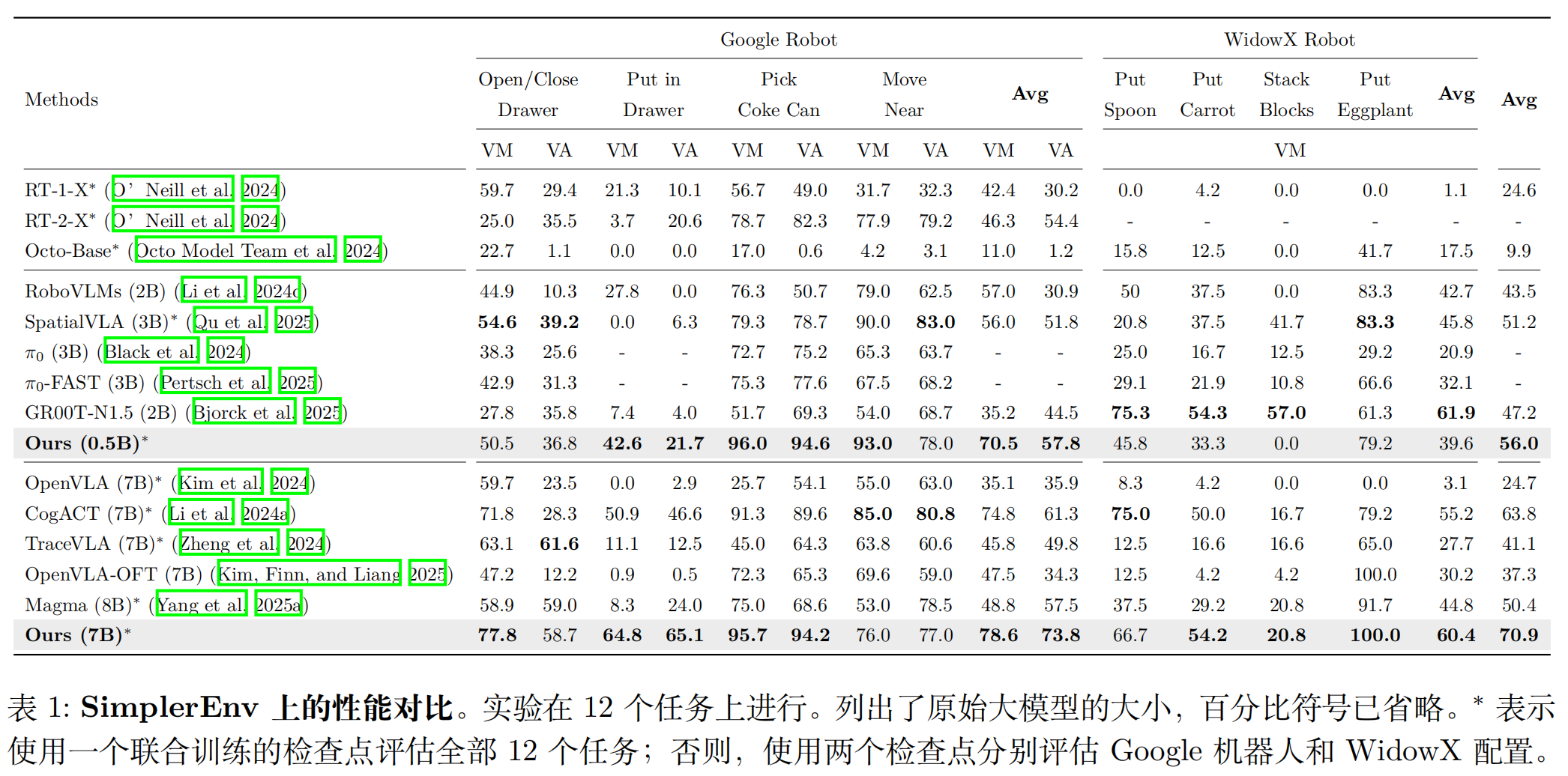 SimplerEnv 包含 Google Robot(GR)和 WidowX Robot 两类机器人,覆盖 “视觉匹配(VM)” 和 “变体聚合(VA)” 两种设置(VA 引入背景、光照变化,更贴近真实)。核心结果: