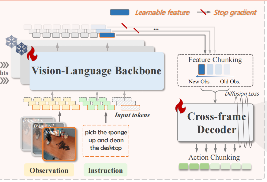 将特征分块 FtMF_t^MFtM 中的“历史帧特征”视为“辅助输入”,用 stop gradient 操作阻断其对单帧 VLA 骨干网的梯度更新 —— 仅让解码器学习历史特征的使用方式,而单帧 VLA 仍保持原有的视觉-语言对齐能力。