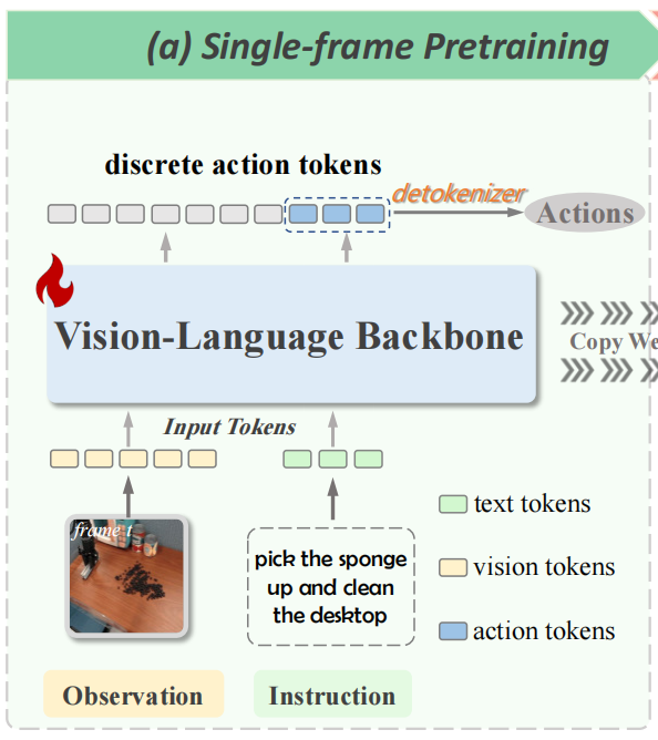 我们首先使用标准的自回归预测在离散动作 token 上训练一个基础的单帧 VLA 模型,从而更方便地利用大规模异构具身数据集,并建立有效的视觉-语言基础模型。