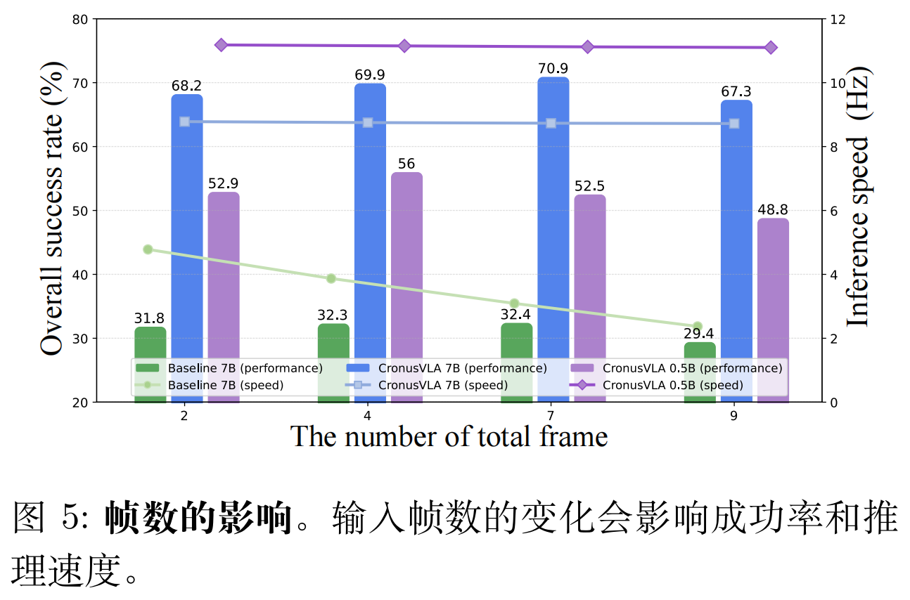 最终,CronusVLA 7B 推理速度达 8.7Hz,0.5B 小模型甚至达 11.1Hz,远超同类多帧模型(如 TraceVLA 7B 仅 4.3Hz)。