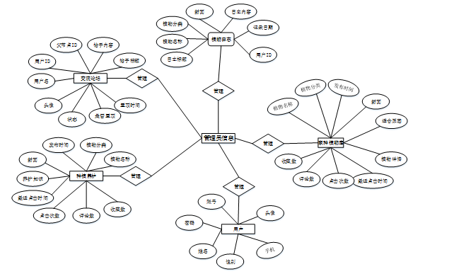 根据功能需求来对系统的e-r图来进行分解得到几种实体,在系统中将“用户、家种植物库、交流论坛、种植养护、植物日志”等作为实体,它们的局部E-R如图4-2所示。