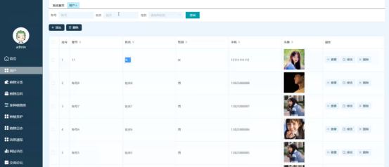 管理员进入主页面,主要功能包括对用户、植物分类、植物百科、家种植物库、种植养护、植物日志、消息通知、网站动态、交流论坛、轮番图管理、我的信息等进行操作。管理员主页面如图5-7示: