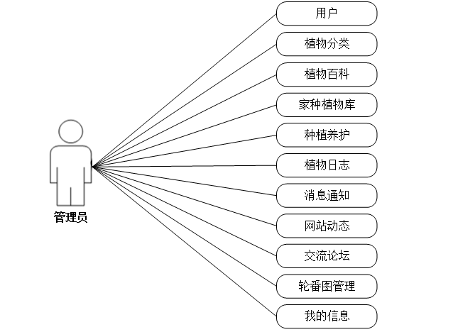 (1)管理员关键功能包含用户、植物分类、植物百科、家种植物库、种植养护、植物日志、消息通知、网站动态、交流论坛、轮番图管理、我的信息等进行管理。管理员用例如下: