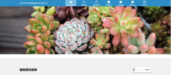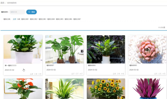 系统首页:轮播大图、热门植物、推荐帖子、养护知识快捷入口千人千面。