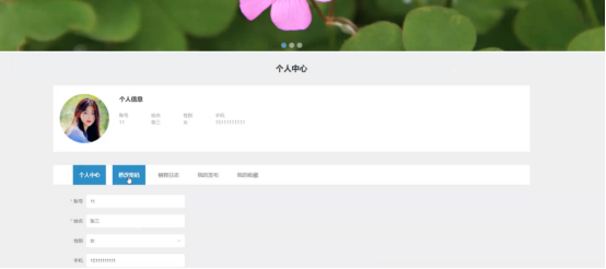在个人中心页面可以对个人中心、修改密码、植物日志、我的发布、我的收藏等功能进行操作;如图5-5所示: