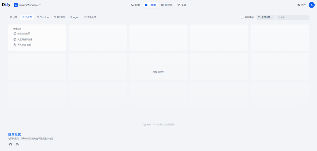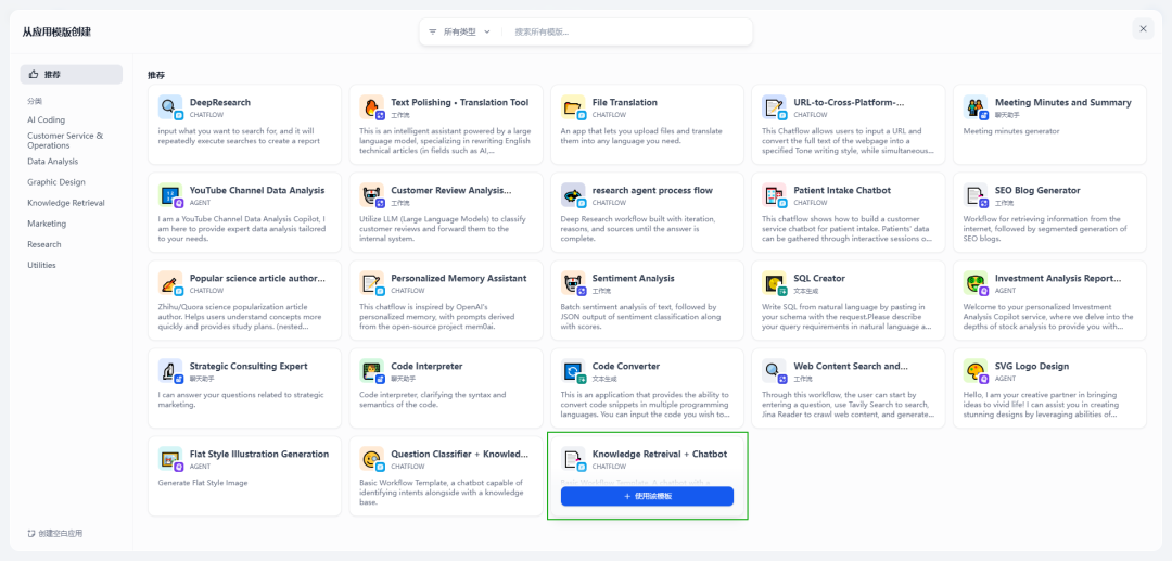 运用Dify内置的应用模板创建基于知识库的问答系统,“工作室”—“从应用模板创建”—“Knowledge Retreival + Chatbot”: