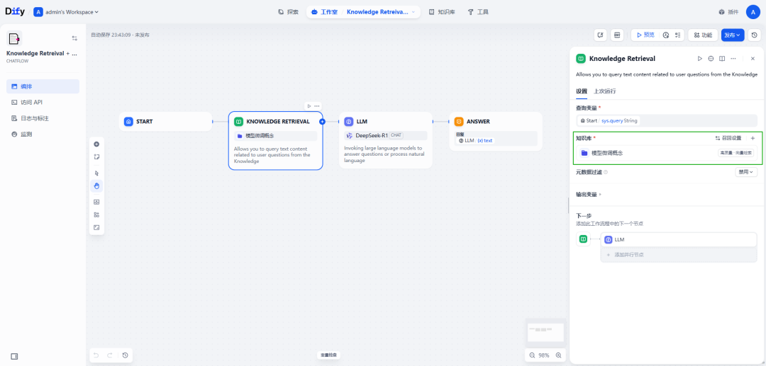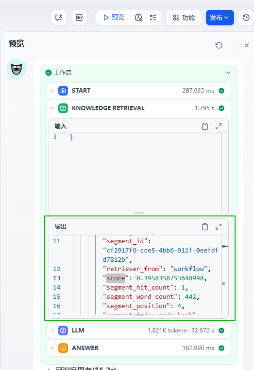 设置完成后进行预览测试,可在工作流中查看每一步的运行情况,在“Knowledge Retrieval”输出中可查看知识库的检索结果: