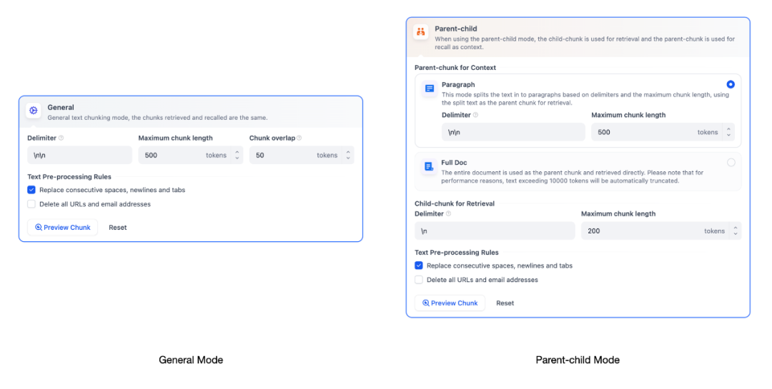 两者的主要区别在于内容区块的分段形式。通用模式的分段结果为多个独立的内容分段,而父子模式采用双层结构进行内容分段,即单个父分段的内容(文档全文或段落)内包含多个子分段内容(句子)。
