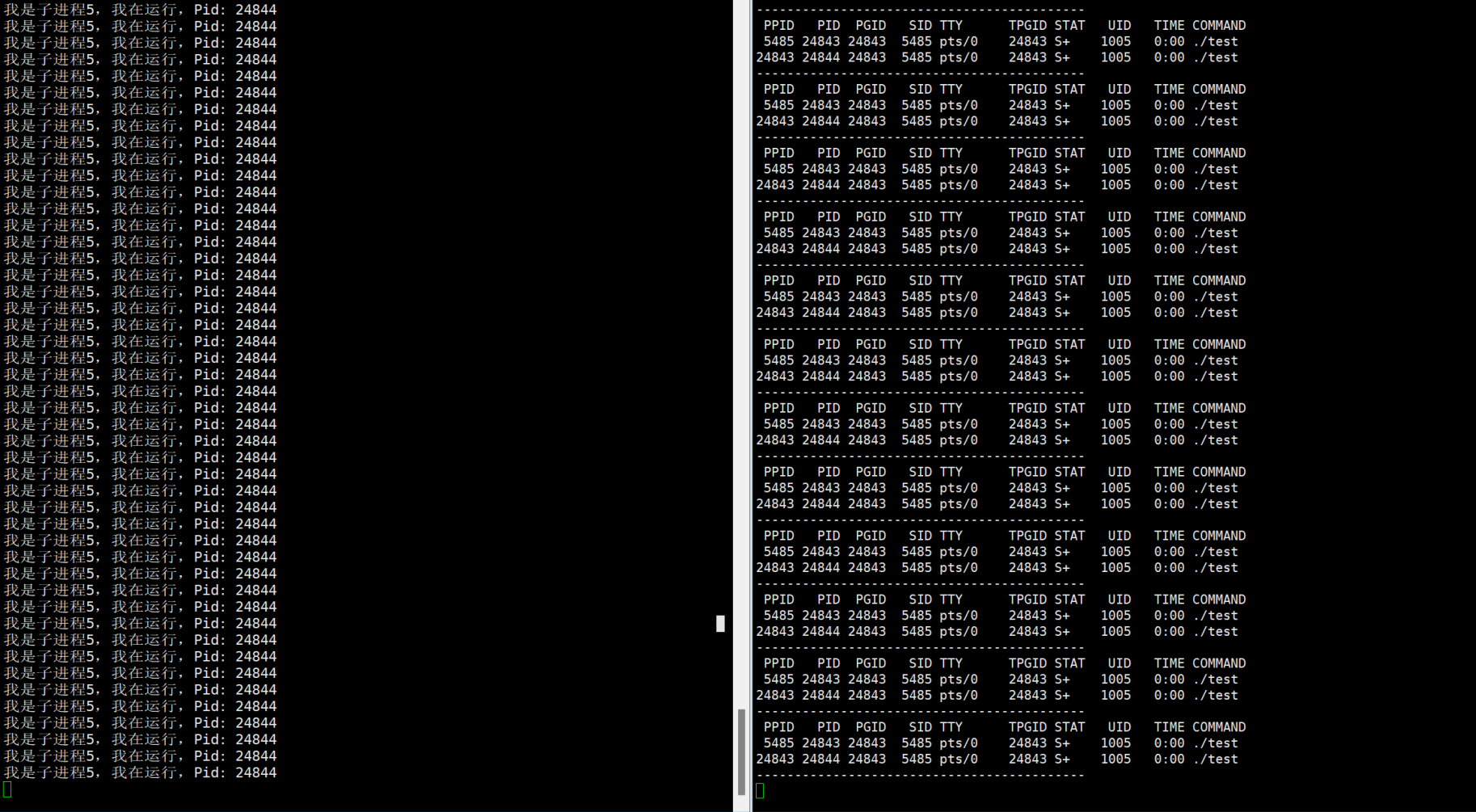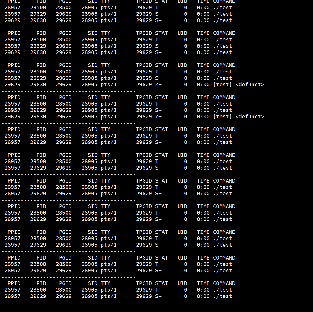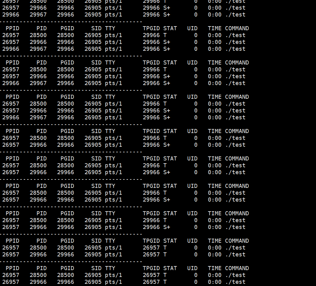 while :; do ps ajx | head -1 && ps ajx | grep test| grep -v grep; echo "-------------------------------------------"; sleep 1; done
