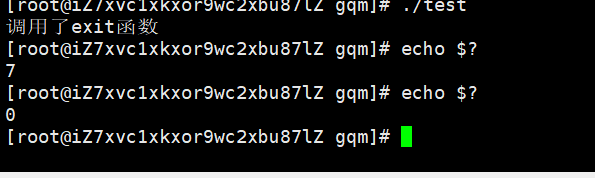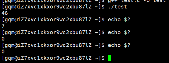$?表示在bash 中,最近一次执行完毕时,对应进程的退出码,这里我们第一次运行test得到的退出码是7,echo $?,也是一个进程,这里它的退出码是0
