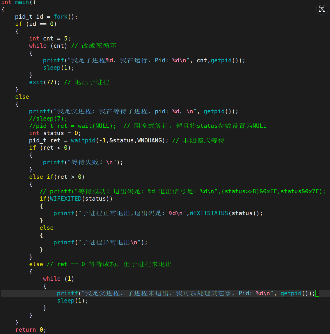 如果 pid_t = 0:在非阻塞等待中,如果子进程没有终止,返回0。