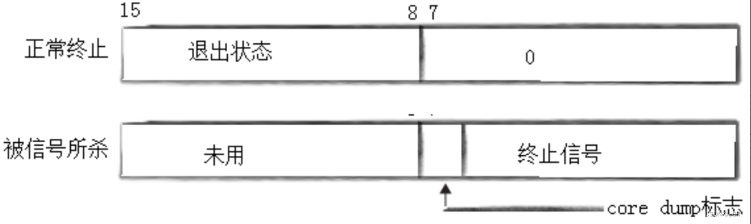 status 的低八位用于表示处理异常的地方,其中有 1 位是 core dump,最上面简单知道就行了。除去 core dump,剩余七位用于进程中的退出信号,这就是 最低七位。