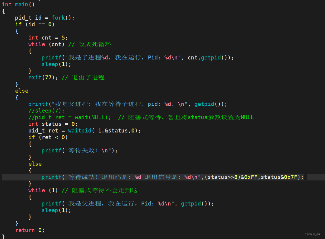 现在上面的代码改一点,使用 waitpid 的 int*ststus参数