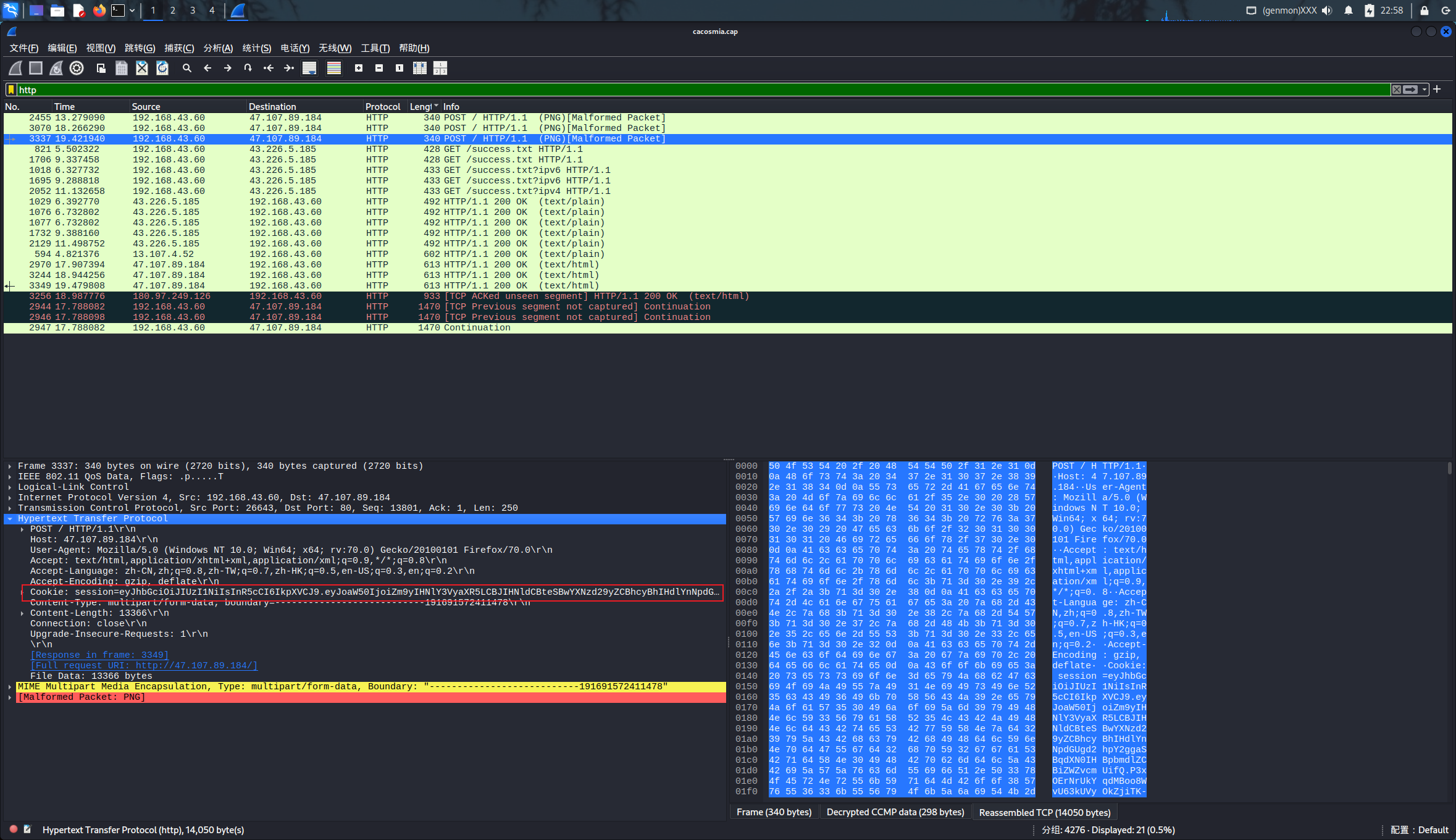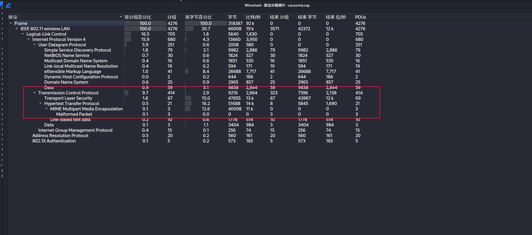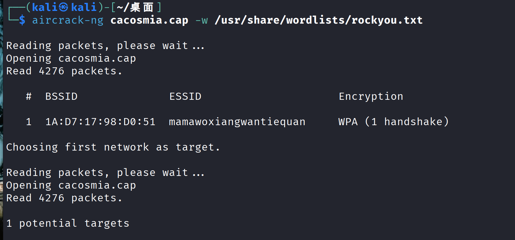 cacosmia.cap 是捕获的无线流量数据包文件,里面包含了目标 Wi-Fi 的 WPA 握手包(文章中提到捕获到 1 个握手包)。