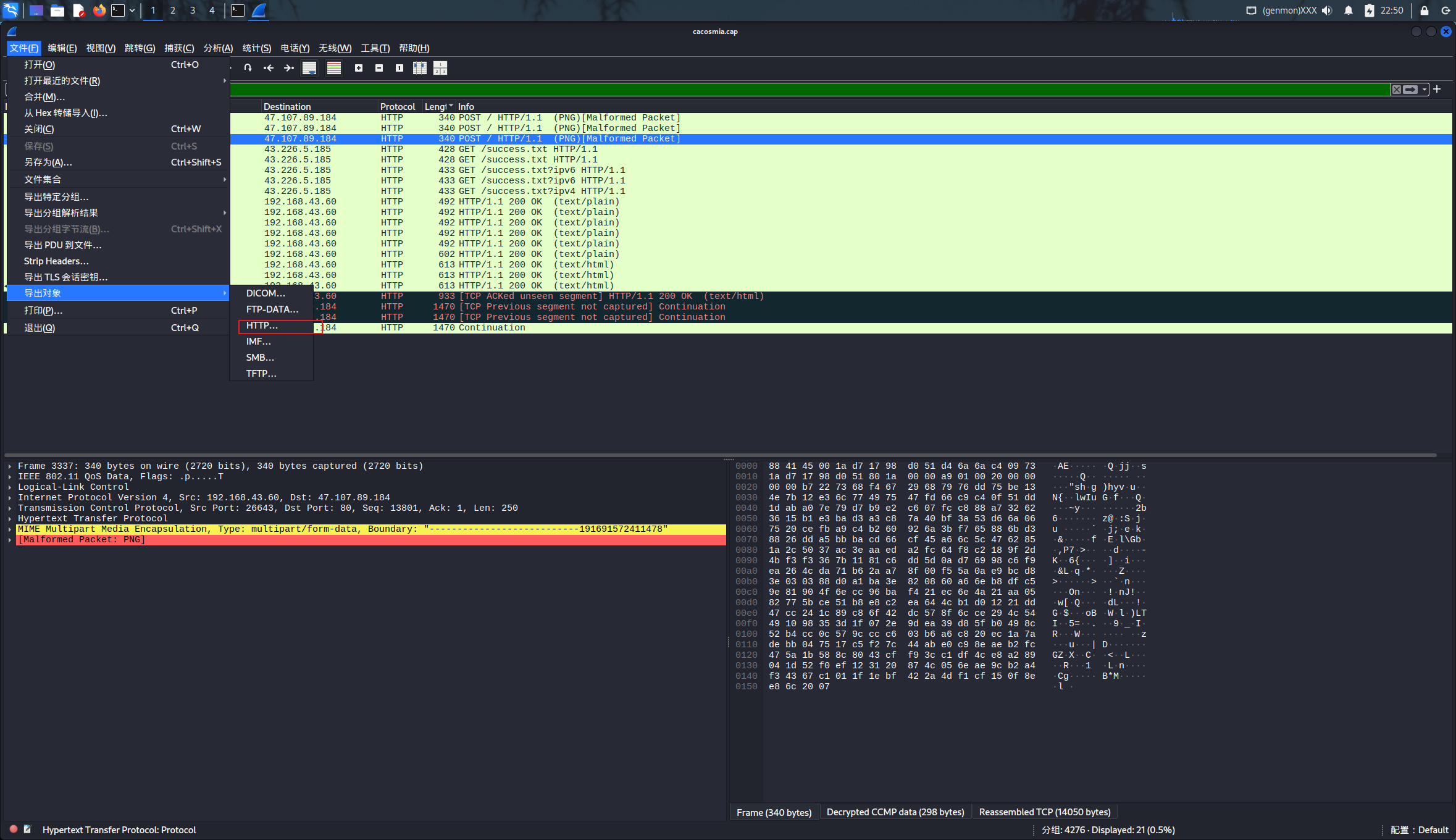 摘要:通过分析IEEE 802.11无线流量包,使用aircrack-ng破解WiFi密码"12345678"后解密数据。在HTTP流量中发现PNG文件和加密ZIP,经base64解码DNS记录提示后,确认密码为"26rsfb.dnslog.cn"。最终解压获得flag{f14376d0-793e-4e20-9eab-af23f3fdc158}。整个过程涉及