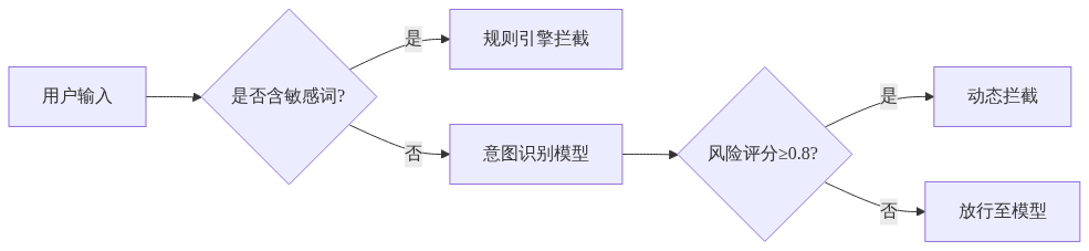 - 输入控制层:通过意图识别、敏感词过滤、权限验证等手段拦截恶意指令.典型技术包括正则表达式匹配(如阻断"弹药制作方法"类指令)和语义理解模型(识别隐含风险,如药物副作用查询的非法用途风险).