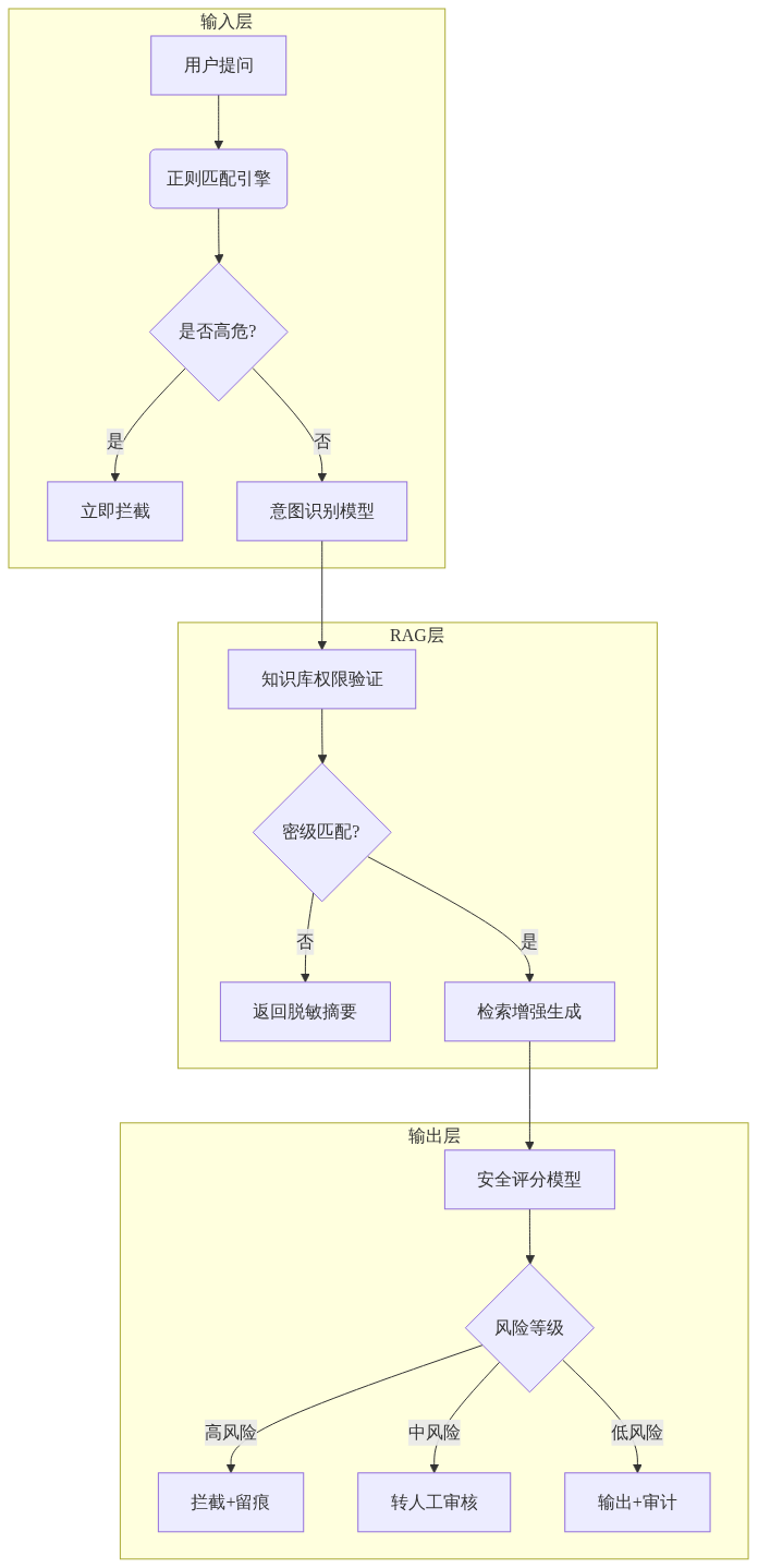 - 运营层:动态风险分级(拦截/人工审核/留痕),安全代答模板库应对三类敏感问题.