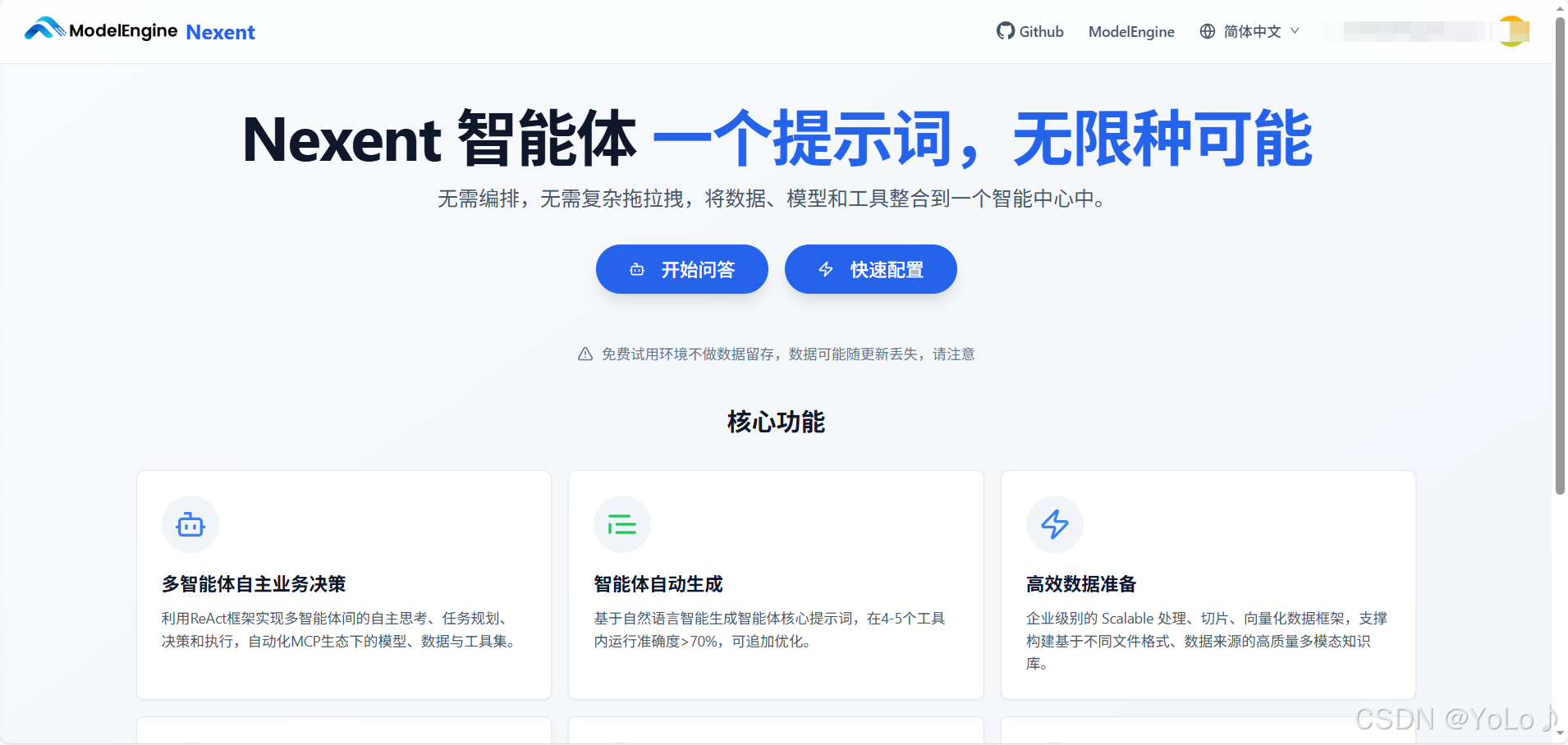 ModelEngine的入门流程非常顺畅。登录平台后,清晰的“一键试用”功能让用户能立即体验预置的智能体应用(如Nexent),这步对于理解平台能力至关重要。