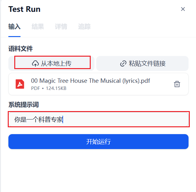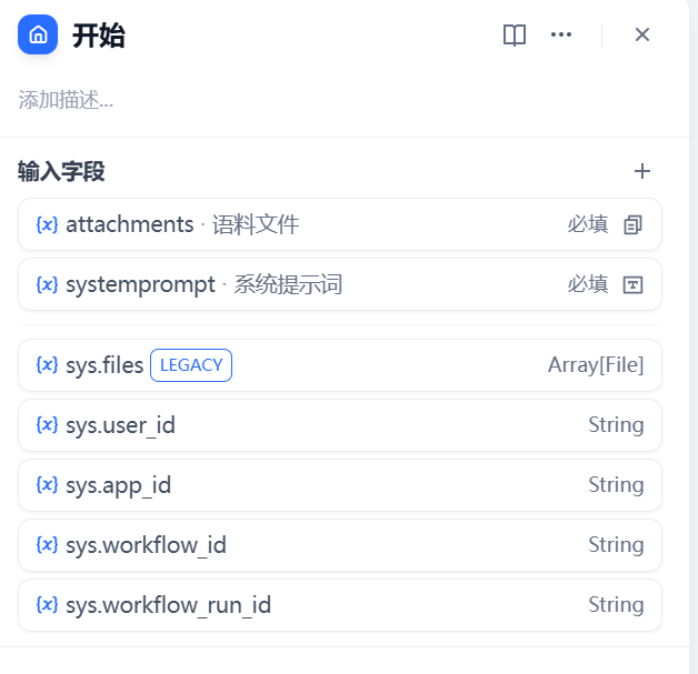 attachments:支持本地/远程 URL 上传文档文件(限制 10MB)systemprompt:必填的系统提示词输入(48 字符限制)
