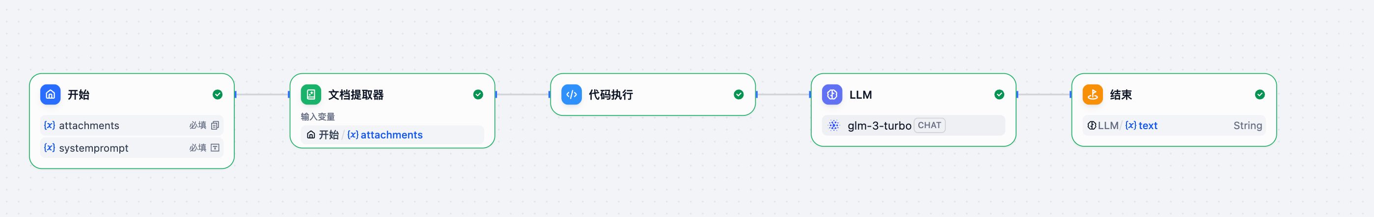 整个流程实现了开始、文档内容解析、数据处理和、LLM 生成和结束等阶段构成,处理流程如下所示: