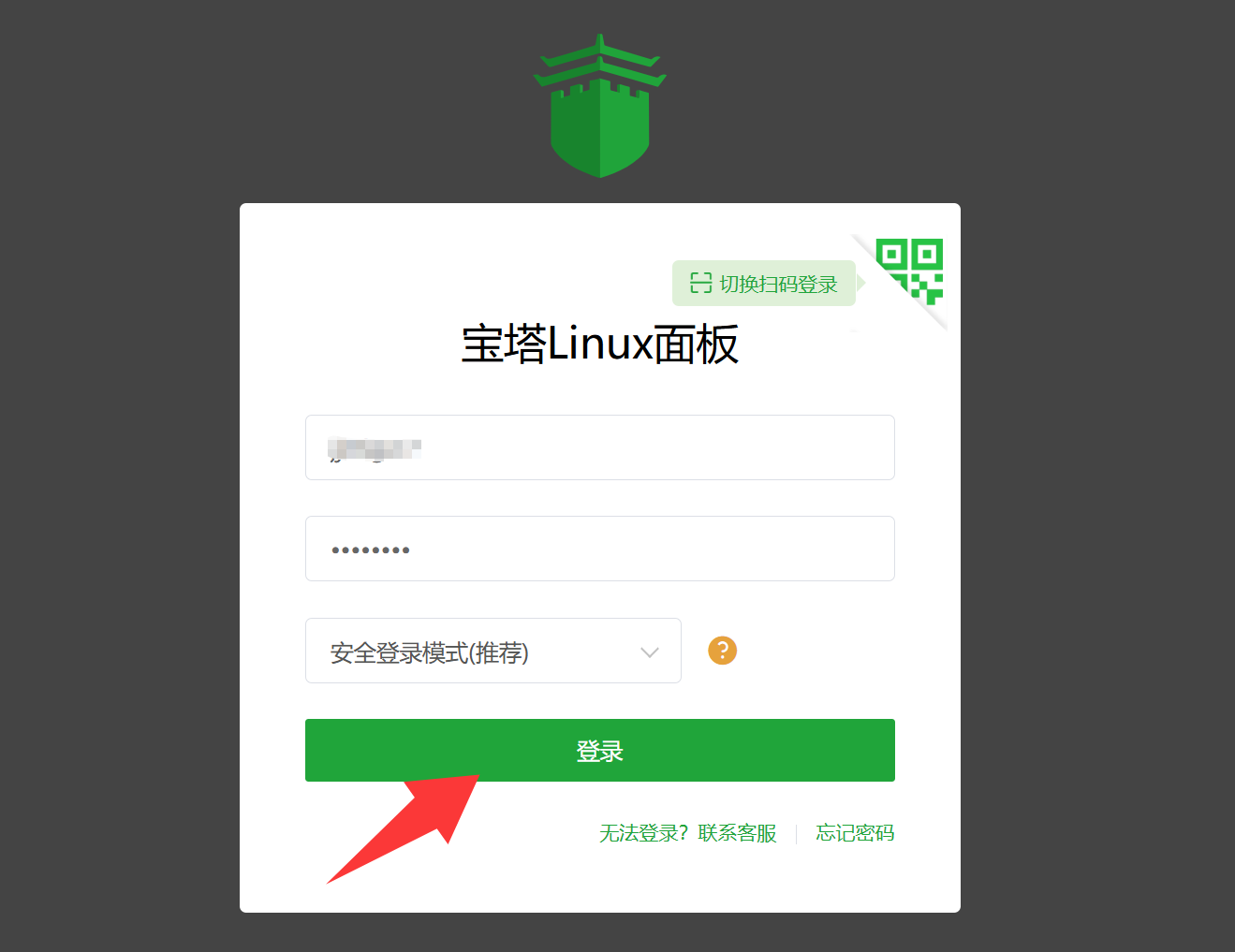 进入宝塔面板的管理后台界面后,输入用户名和密码 (也就是前面给出的 username 和 password 信息),就可以登录了。