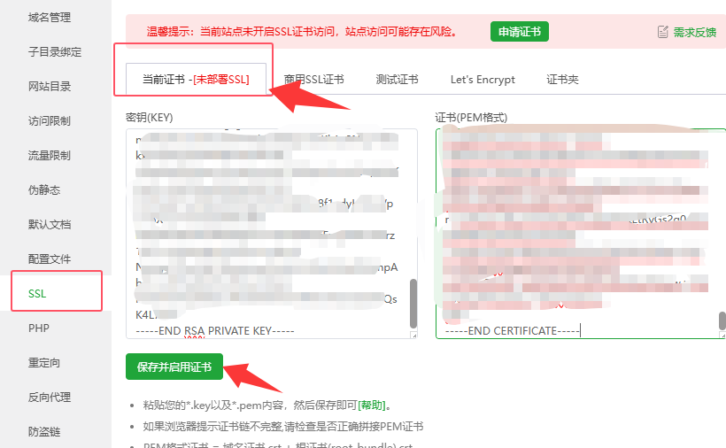 这两个文件一般需要用编程的软件(例如notepad++等)才能打开这个格式。这里教大家一个简单的方法,直接把这个文件拖动到浏览器页面,就能自动打开了。然后把里面的内容复制到对应的位置。(选择SSL - 当前证书 ),点击 “保存并启用证书”。