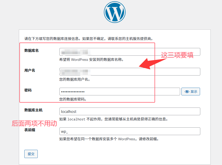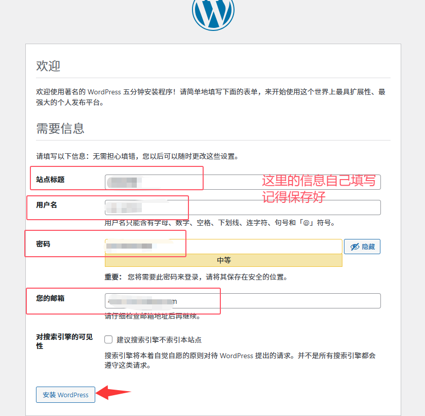 填写自己的站点信息,自己保存好。(不用太纠结,后面也可以随时更改),点击“安装WordPress”