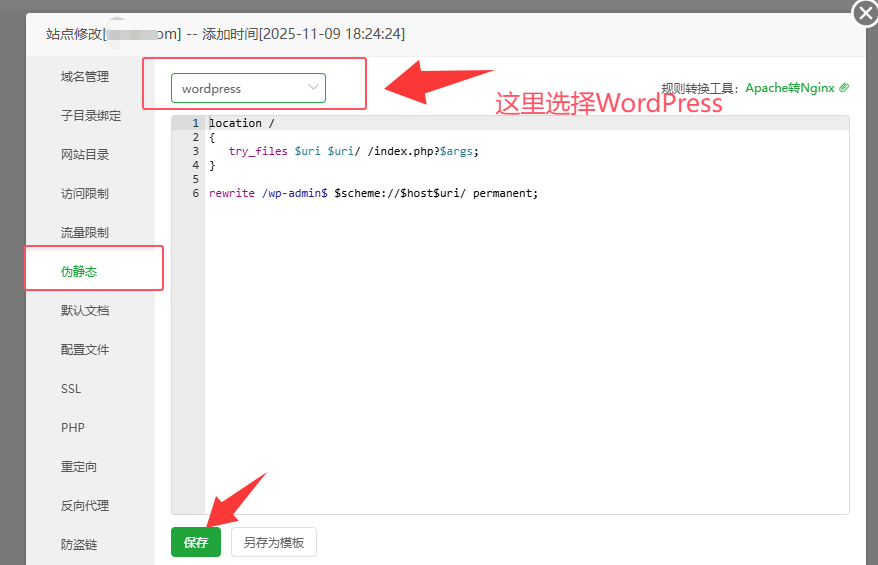 先去宝塔面板后台,找到网站设置,选择“伪静态”,选择“WordPress”,然后点击“保存”