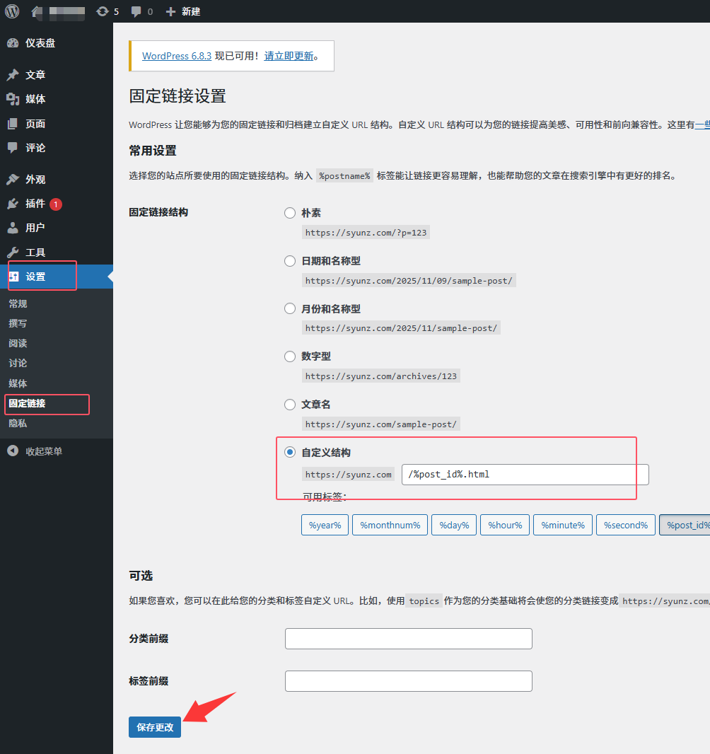再去打开WordPress网站管理后台,选择 “设置”-“固定链接”,再选择 “自定义结构”,我通过使用的是id名加上.html后缀。例如syunz.com/%post_id%.html ,按照我图片里的填写就行。这样你的网站每篇文章都有一个固定的链接,后缀为ID号加上.html ,这样有利于SEO优化,也更加简单易读。