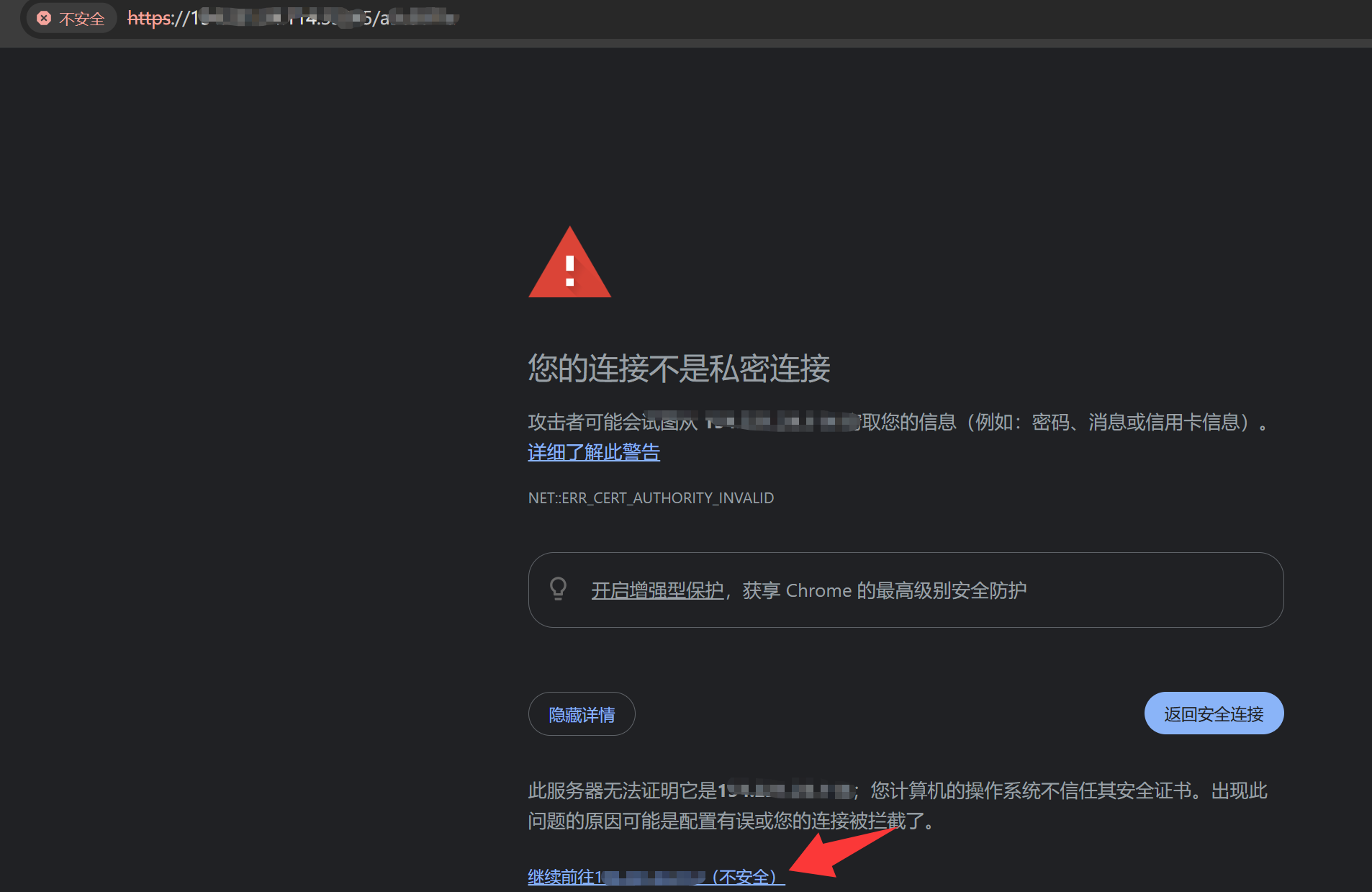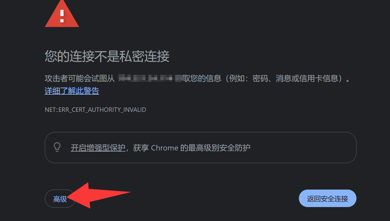 因为没有安装SSL证书,无法通过https协议访问,所以提示不安全,只需要点击“高级”,继续访问就行了。