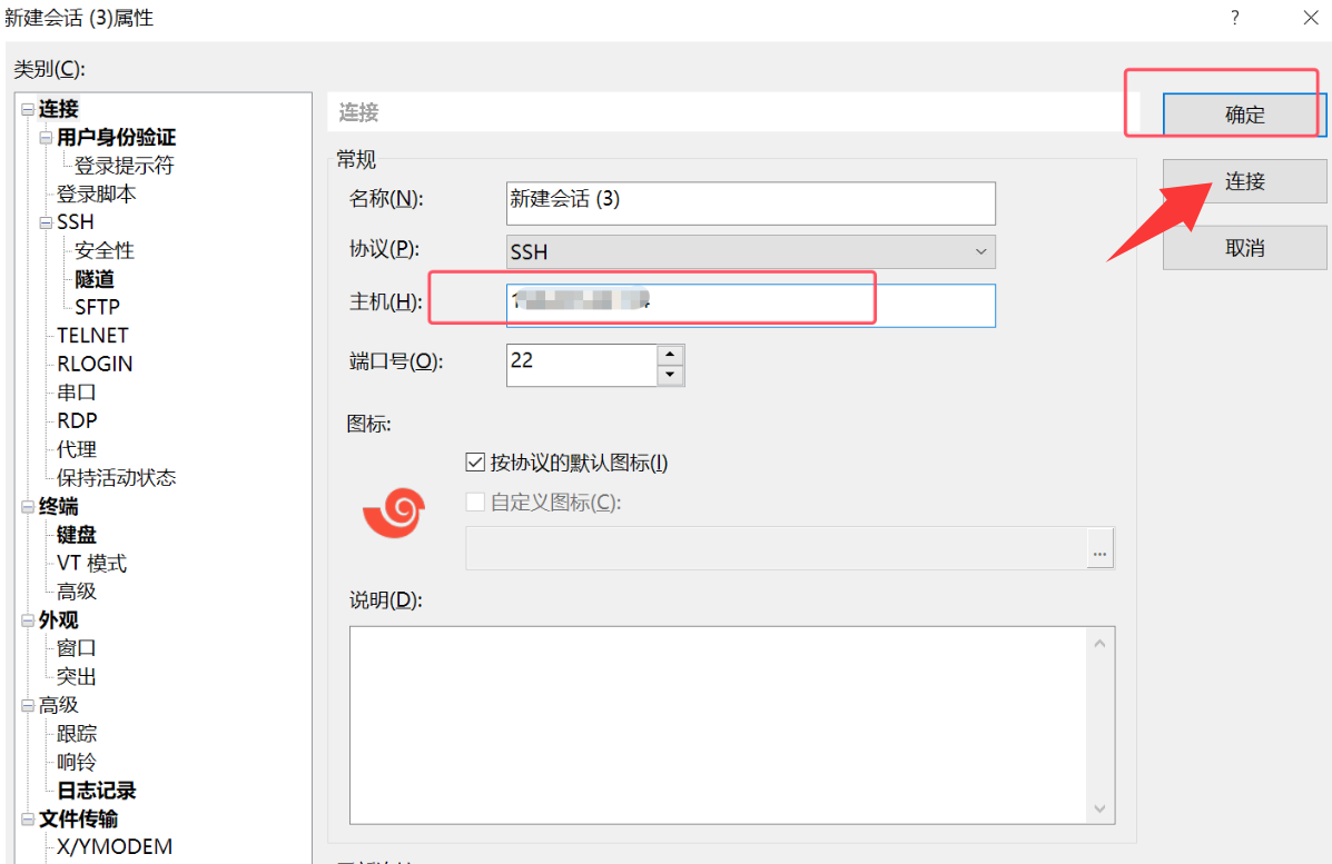 下载完成后,打开Xshell,然后 新建会话,主机填写你的服务器公网IP地址,然后点击 连接。