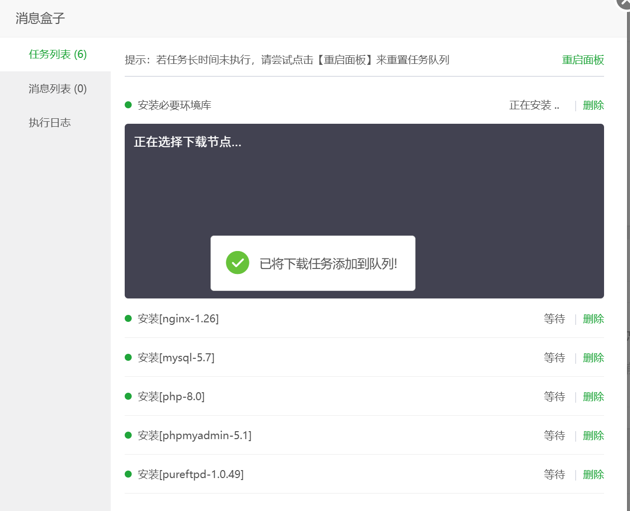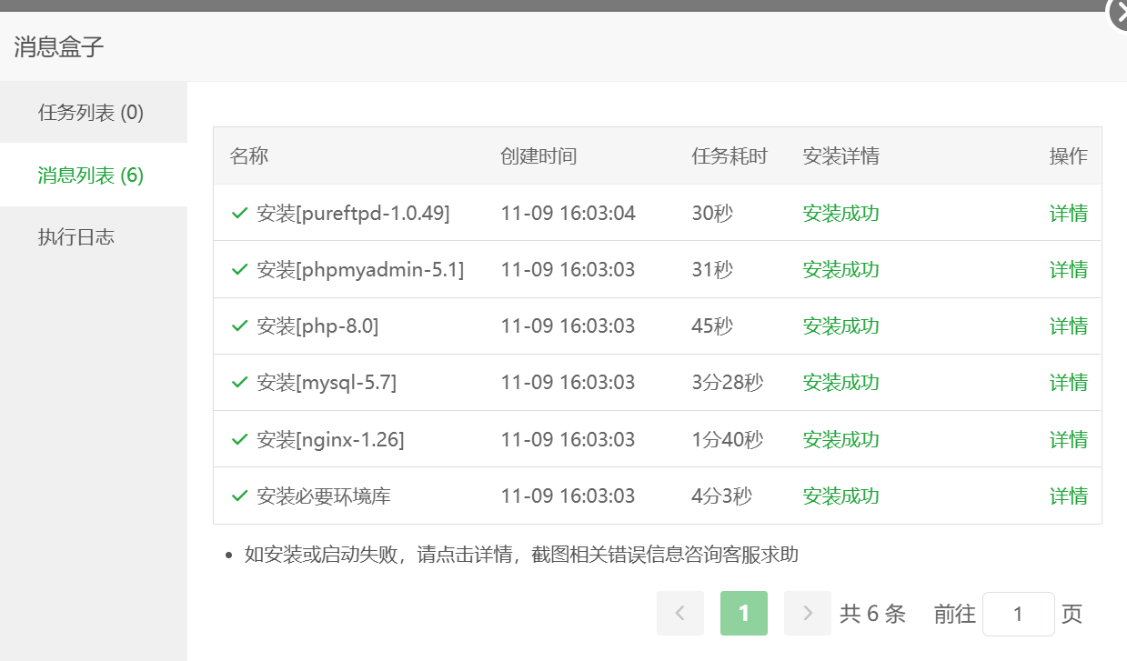 注意一下,上面的Nginx 、MySQL 、PHP 等这些版本号,是可以自行调整的。如果后面发现自己安装的版本与网站主题不兼容,也是可以卸载,然后重新安装对应版本的。所以,这里不必太纠结。