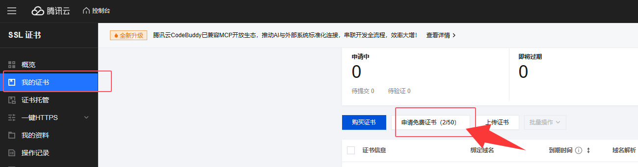 我以腾讯云为例,找到SSL证书管理,选择“申请免费证书”