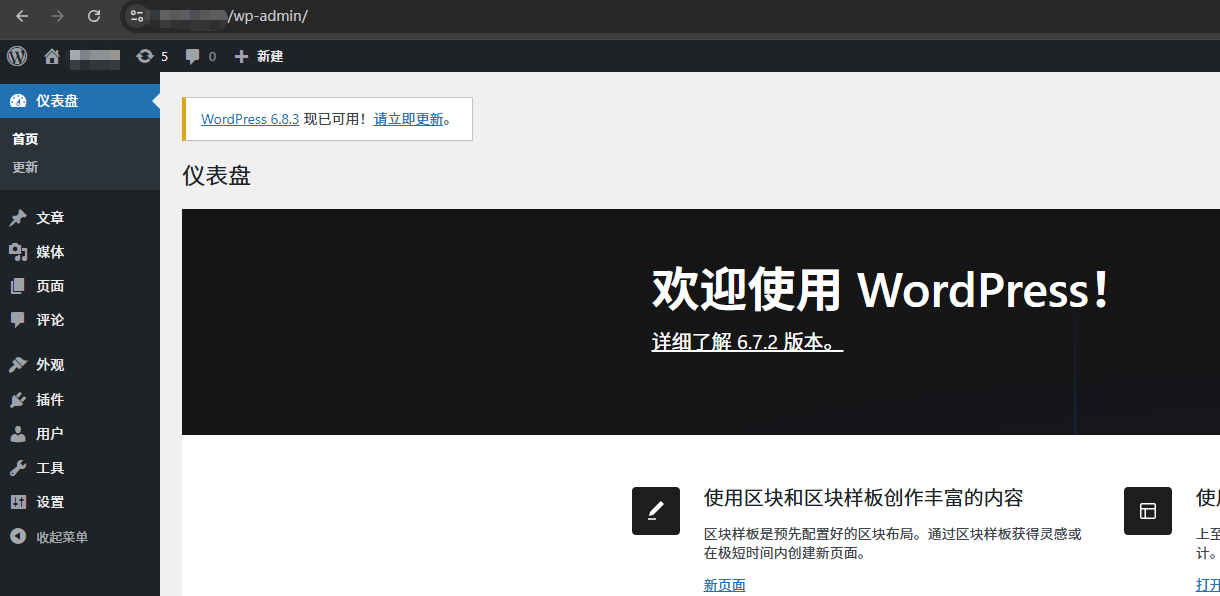 登录成功后就进入到WordPress网站后台配置页面了。