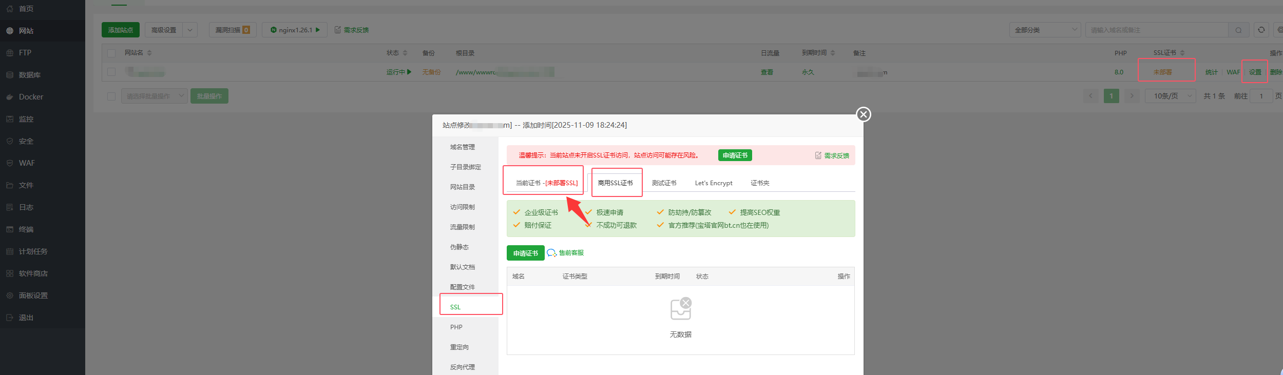 这个时候你可能会打不开页面,因为你还没有部署SSL证书