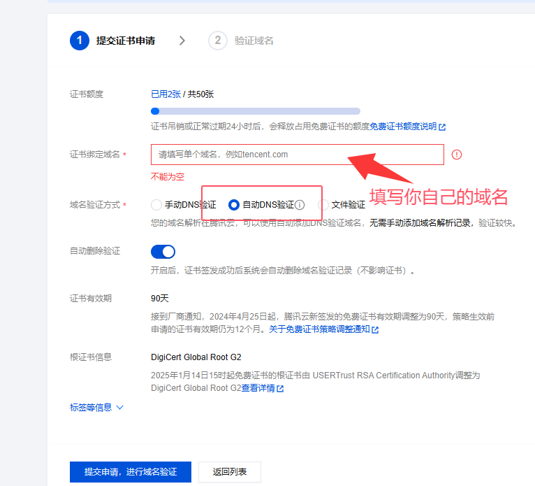 然后,填写你的域名,建议选择“自动DNS验证”, 最后点击 “提交申请”即可。一般几分钟证书就签发了。不过注意有效期只有三个月,过期后 重新这样申请一遍就行了。