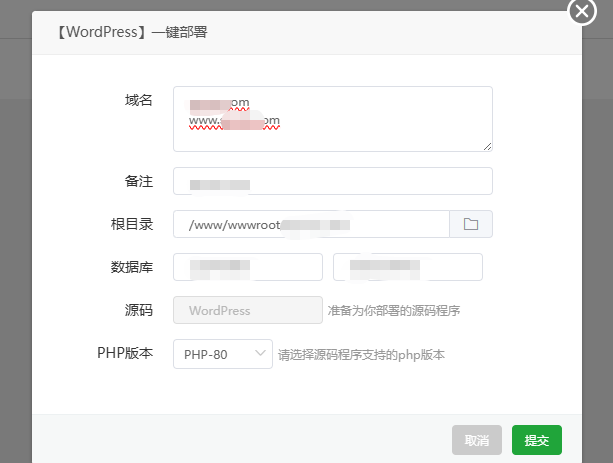 填写域名信息 (这里域名 可以填写多个,一行一个,都是指向该网站,第一行是网站默认显示的域名),然后点击 提交